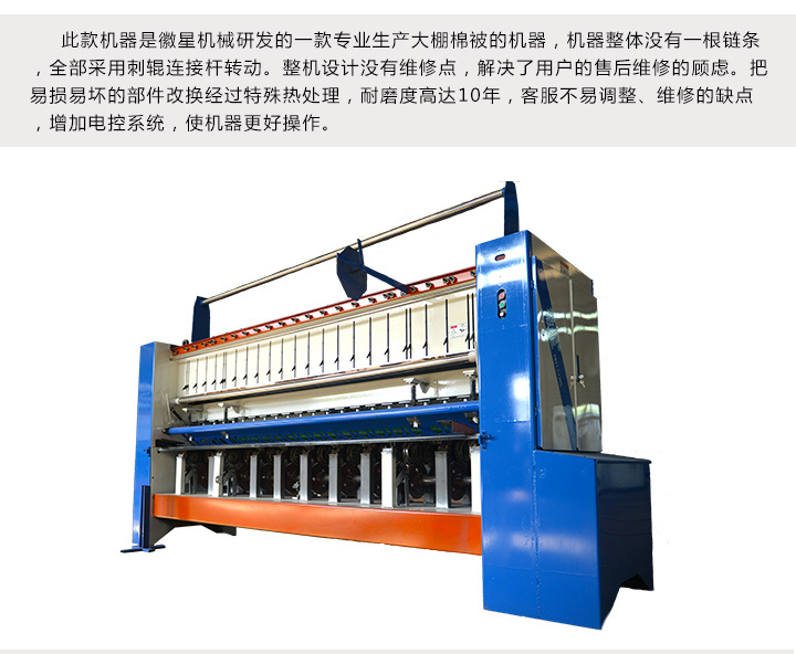 產品簡介:保溫被機是專門生產大棚保溫被的一種機器。理想的保溫被應具有傳熱系數小,保溫性好,重量適中,易于卷放,防風性、防水性好,使用壽命長等優點。大棚保溫被機為了生產這種保溫被,經過多年的努力終于,生產出了一種專業生產大棚棉被的絎縫機,又被稱為3米寬幅雙梁大棚棉被機(44針)。 本3米寬幅雙梁44針大棚保溫被機(雙梁大棚保溫被機)所縫的單線鏈式針跡,具有線跡美觀、富有彈性、線鏈牢固、拆線方便等優點。把易損易壞的部件改換耐磨材料,克服不易調整、維修的缺點,增加電控系統,使機器更好操作等特點。