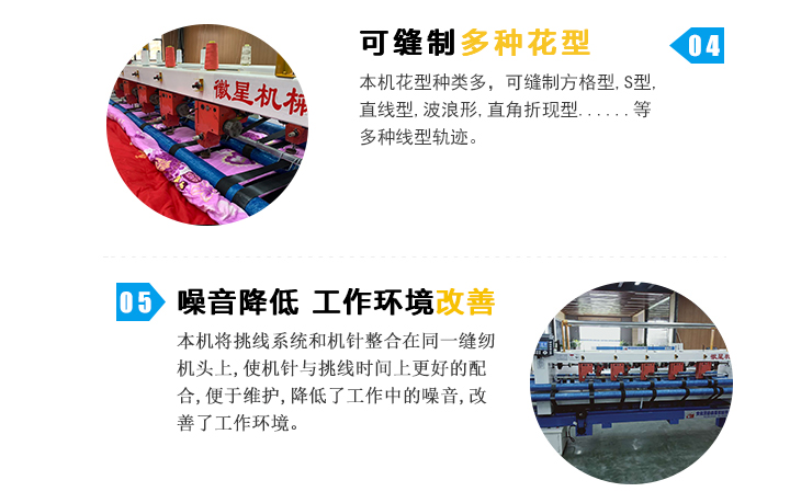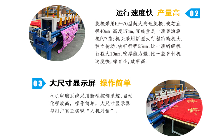 高速多針電腦絎縫機(jī)集電腦絎縫機(jī),多針底線直絎機(jī)及家用縫紉機(jī)的優(yōu)點(diǎn),集成度高,絎縫速度快,花型種類多,是本公司新研制的新一代高速電腦絎縫機(jī)。